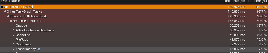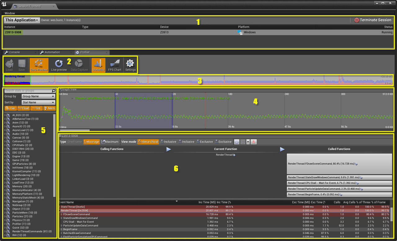 이는 시작 시 단말기 내부에 ue4stats 확장자의 파일이 생성되고 이 파일을 Profiler에 로드해 사용하는 것인데, 다른 프로파일링 도구와 비교해 게임의 성능 저하가 적고 사용법이 간단하기 때문에 권장하는 도구이다. 프로젝트에서는 위의 자동화된 통계수집도구와 결합해 사용하였다.