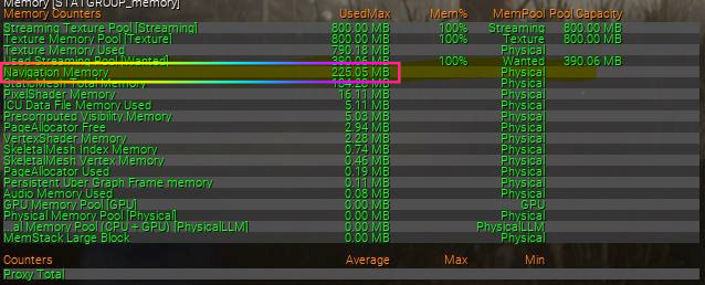 프로젝트 A의 경우, 심리스 월드에서 네비게이션 메모리가 1GB씩 잡혀 가용 메모리를 까먹는 주요 원인 중 하나였다. 모바일에서 굳이 필요없다면 월드 세팅으로 네비게이션 시스템을 비활성화하자.