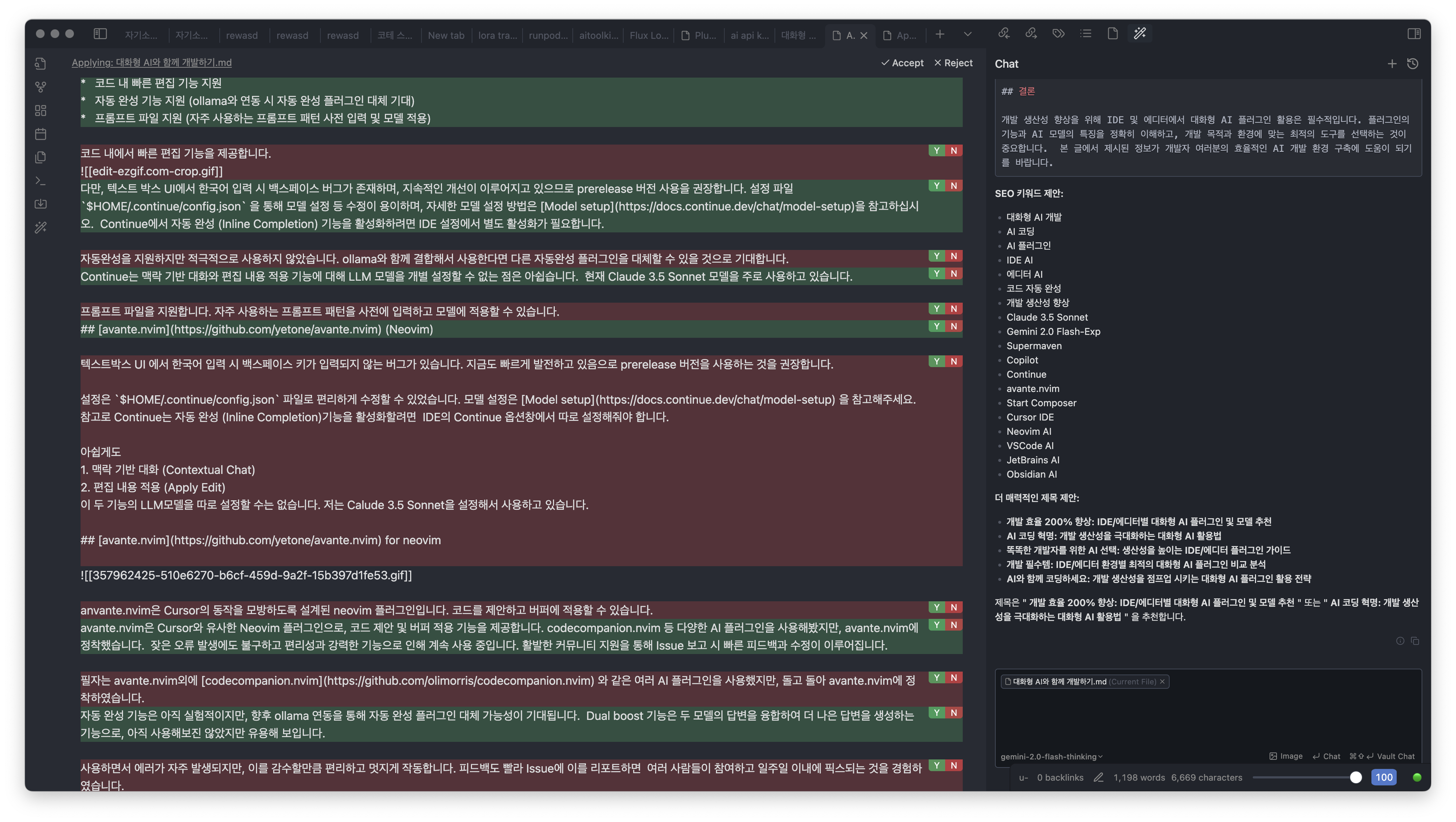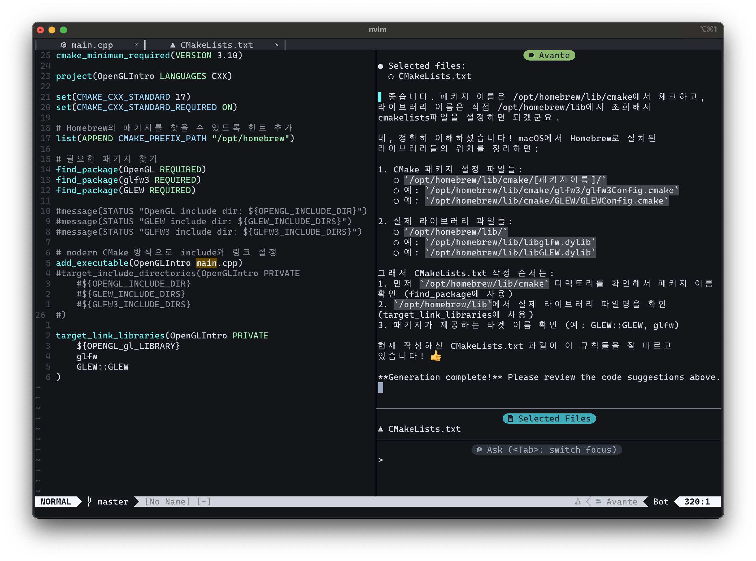 avante.nvim은 Neovim용 AI 보조 플러그인으로, 맥락 기반 대화와 코드 적용 기능을 제공합니다. 여러 AI 플러그인을 시도해본 결과, avante.nvim이 가장 만족스러웠습니다. 가끔 오류가 발생하지만, 편리성과 강력한 기능 때문에 계속 사용하고 있으며, 커뮤니티의 활발한 지원으로 문제 보고 시 빠른 해결이 이루어집니다.