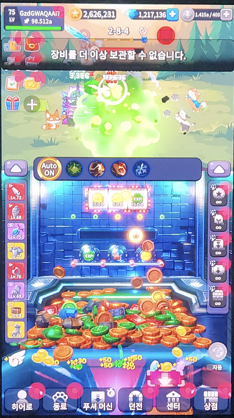 하단의 코인들 밀어넣어서 떨어트리는 걸 코인도저라고 부르나요? 이런 조합의 게임은 처음 봐서 신선했습니다. 코인도저 UI에 눈이 자꾸 가게 되네요. 스낵게임의 좋은 선택지 중 하나로 고려해 볼 것 같습니다.