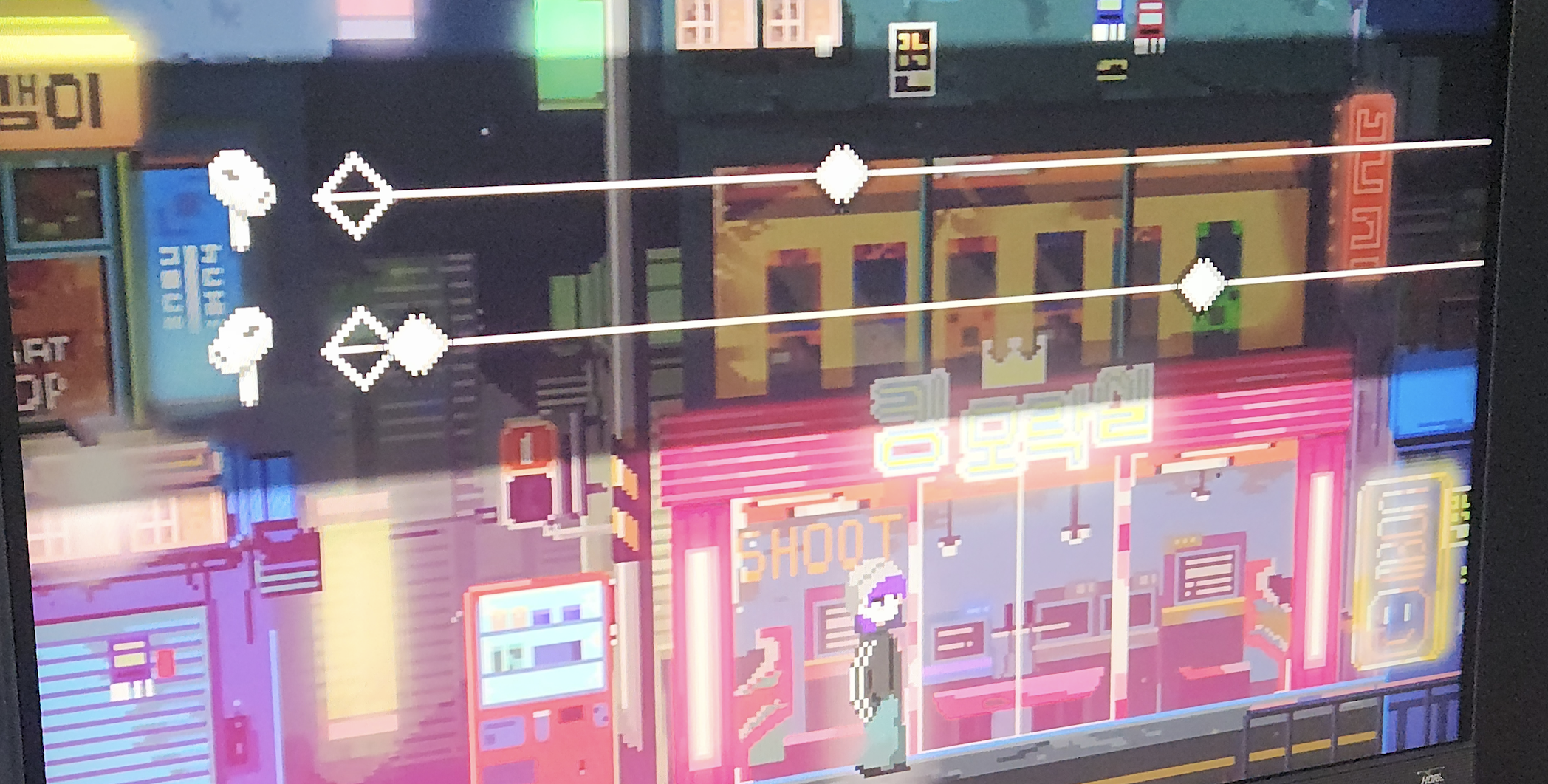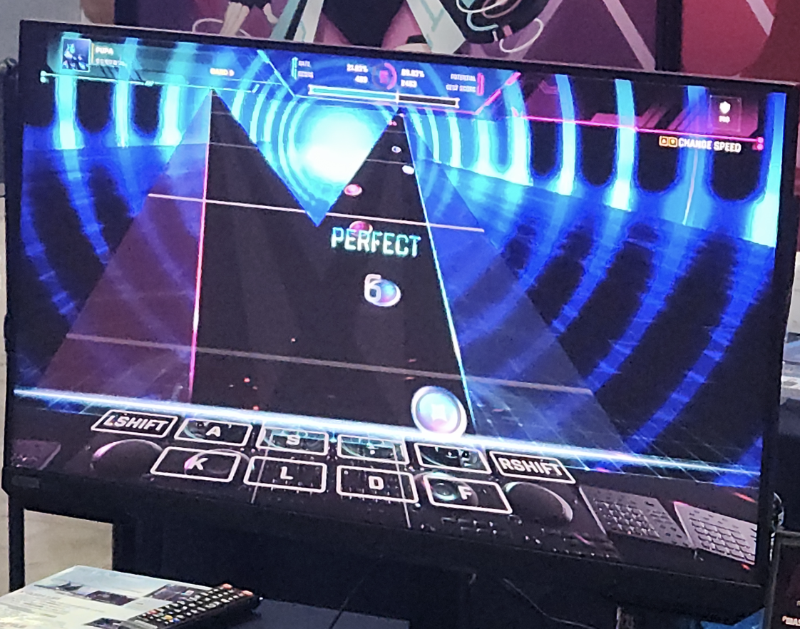 리듬게임 매니아답게 입장하자마자 허겁지겁 리듬게임 부스로 달려갔습니다. 처음 보는 신작이 있었는데, 전통적인 노트 기반이지만 레인이 2개로 나뉘거나 사운드볼텍스처럼 라인이 좌우로 흔들리는 게 인상 깊었습니다. 직접 해보고 싶었지만, 줄이 길어서 패스했습니다. 스팀에 출시된 상태라고 하니 집에서 해봐야겠습니다.