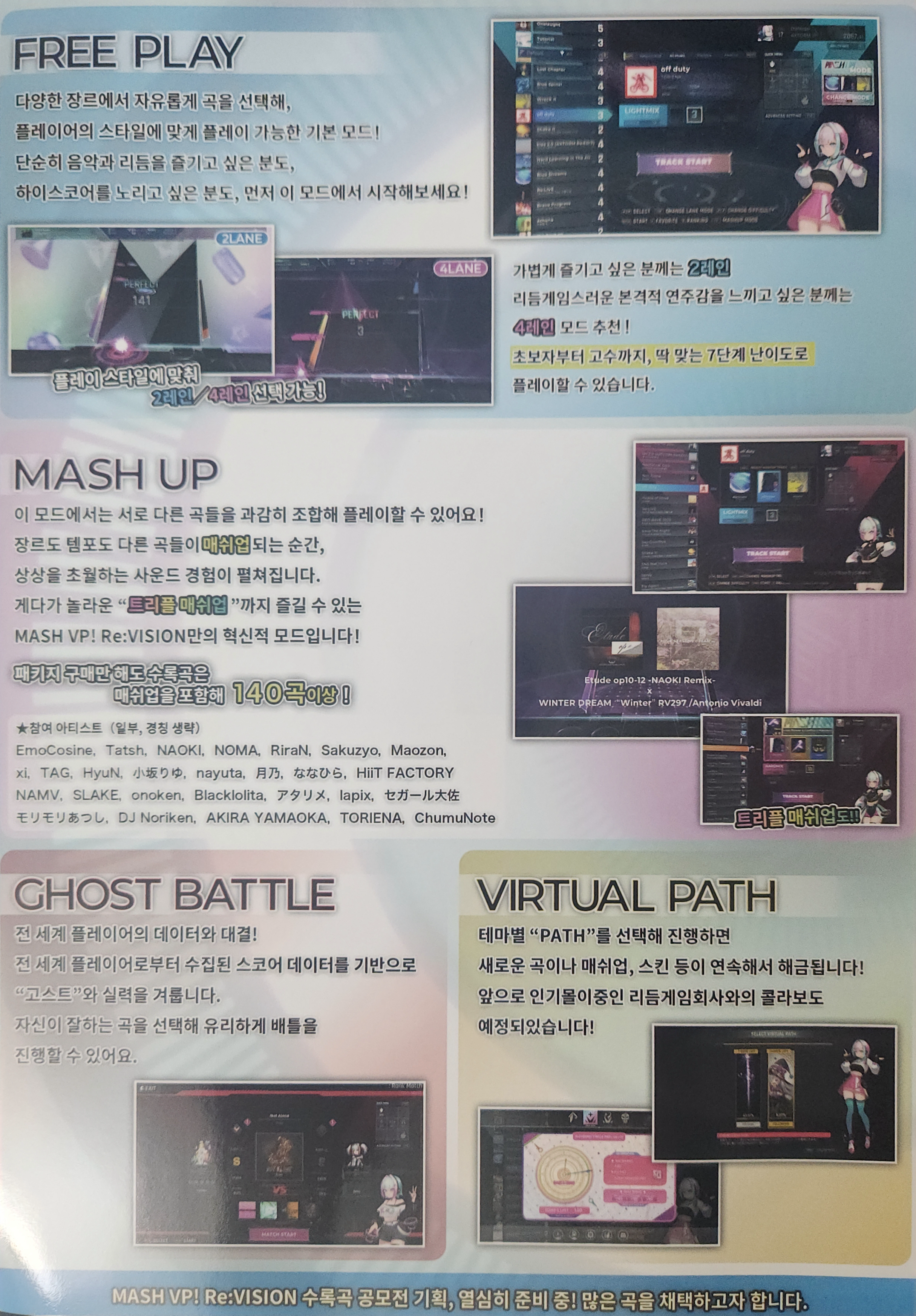 팜플렛도 챙겨왔습니다. 여기서의 MASH UP 모드가 레인이 2개로 플레이하는 걸로 추측되네요.