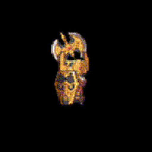 | Keye | The video features a pixel art animation of a knight in a dynamic action pose. The knight is depicted with a golden armor that includes a helmet, chest plate, and shoulder guards, all intricately detailed with a mix of gold and brown hues. The knight wields a large, curved axe in their right hand, which is also rendered in a golden color with a sharp, menacing blade. The background is entirely black, which makes the knight’s golden armor and the axe stand out prominently. The animation style is reminiscent of classic video games, with a focus on pixel art that gives the character a retro, nostalgic feel. The knight appears to be in a combat stance, suggesting readiness for battle or an ongoing fight sequence. The overall composition of the image is centered, with the knight occupying the middle portion of the frame, drawing the viewer’s attention directly to the character. The animation does not show any movement or action, but the pose and the weapon suggest a moment of intense action or preparation for an attack. The use of color is limited to the golden tones of the armor and the axe, which contrasts sharply with the black background, enhancing the visual impact of the character. | 역동적인 액션 자세의 기사를 픽셀 아트 애니메이션으로 보여준다. 기사는 헬멧, 가슴 갑옷, 어깨 보호구를 포함한 금색 갑옷으로 묘사되며, 모두 금색과 갈색 색조의 혼합으로 정교하게 세밀하다. 기사는 오른손에 크고 휜 도끼를 휘두르며, 이 또한 날카롭고 위협적인 날을 가진 금색으로 렌더링되었다. 배경은 완전히 검은색으로, 기사의 금색 갑옷과 도끼를 두드러지게 만든다. 애니메이션 스타일은 캐릭터에 레트로하고 향수를 불러일으키는 느낌을 주는 픽셀 아트에 중점을 둔 고전 비디오 게임을 연상시킨다. 기사는 전투 자세에 있는 것으로 보여 전투 준비나 진행 중인 전투 시퀀스를 시사한다. 이미지의 전체 구성은 중앙에 있으며, 기사가 프레임의 중간 부분을 차지하여 시청자의 관심을 캐릭터에게 직접 끈다. 애니메이션은 어떤 움직임이나 행동을 보여주지 않지만, 자세와 무기는 강렬한 행동이나 공격 준비의 순간을 시사한다. 색상 사용은 갑옷과 도끼의 금색 톤에 제한되어 있으며, 이는 검은 배경과 날카롭게 대조되어 캐릭터의 시각적 임팩트를 향상시킨다. |