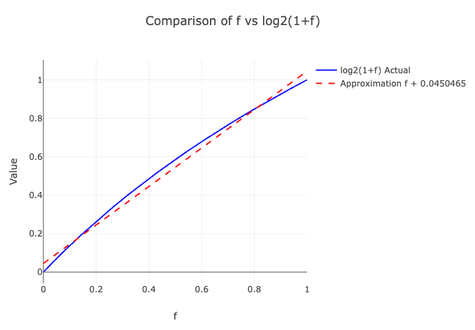 \[\log_2(1+f) \approx f + \sigma\]여기서 $\sigma = 0.0450465$, $f \in [0,1)$ 범위에서 $f$와 $\log_2(1+f)$ 간의 오차값들을 분석하여 평균 오차를 최소화하도록 경험적으로 계산된 보정값이다.